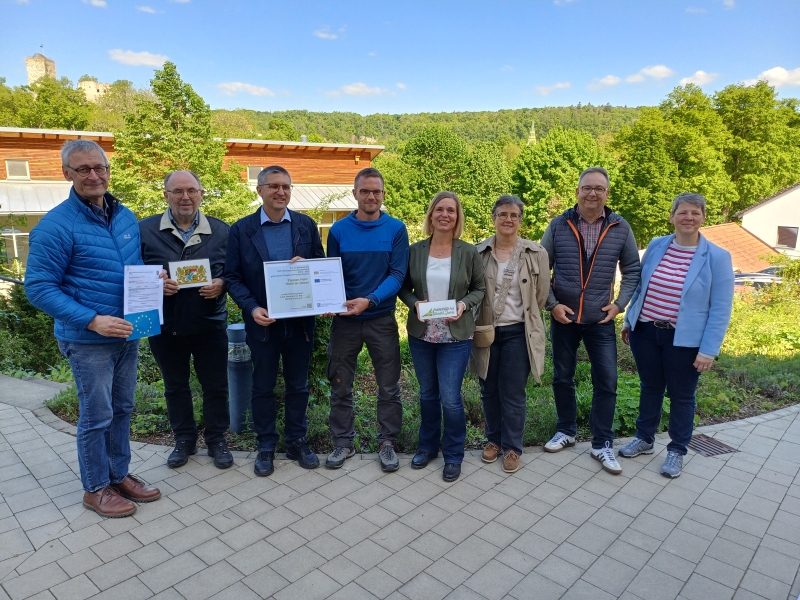 „Wurzelhütte“, „Kobelnest“ und „Wipfelblick“ – das sind die drei zentralen Bausteine im Projekt „Pappen.Hain: Wald (er-)leben“, mit dem das Evangelische Bildungs- und Tagungszentrum Pappenheim (EBZ) in eine neue Ära der umwelt- und erlebnispädagogischen Bildungsangebote startet. Mit einer Fördersumme von knapp 130.000 € aus dem LEADER-Förderprogramm können die lang geplanten Vorhaben umgesetzt werden. Den offiziellen Bewilligungsbescheid überreichte LEADER-Koordinator Erich Herreiner (AELF, links im Bild) im Rahmen einer Feierstunde an EBZ-Einrichtungsleiter Christian Söllner und Projektleiter Michael Herrmann (3. und 4. v.l.), im Beisein von Projektbeteiligten sowie Vertreter*innen aus Kirche und Politik. Herreiner betonte dabei: „LEADER ist ein Förderprogramm, von dem insbesondere ländliche Regionen profitieren. Mit dem Projekt Pappen.Hain – Wald (er-)leben wird ein überregional beispielhaftes umwelt- und erlebnispädagogisches Angebot geschaffen und durch die EU gemeinsam mit dem Freistaat Bayern unterstützt.“ Verschiedene Entwicklungsziele der LAG Monheimer Alb-AltmühlJura werden durch das Projekt ganz konkret erfüllt: Im Handlungsziel 1.1. leistet „Pappen.Hain“ als Maßnahme in der erlebnisorientierten Umweltbildung und im Bereich Naturschutz einen messbaren Beitrag zur umweltpädagogischen Aufwertung der Region. Zudem erfährt das LAG-Gebiet eine Aufwertung und Schaffung von zielgruppengerechten Freizeit- und Tourismusangeboten (Handlungsziel 2.1.). Das EBZ Pappenheim fördert mit Pappen.Hain soziale Kompetenzen und Resilienz der Teilnehmenden, wirkt sich aber auch durch die enge Vernetzung der Projektbeteiligten positiv auf das soziale Gefüge in der Region aus und zahlt damit in das Handlungsziel 3.1. „Förderung und Stärkung des sozialen Miteinanders“ ein.
